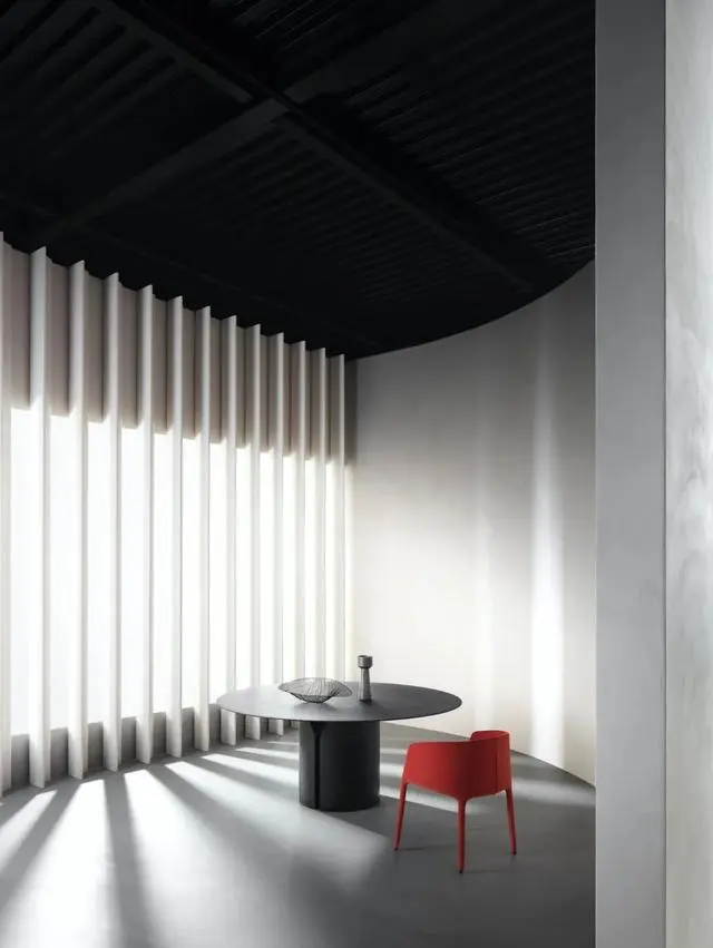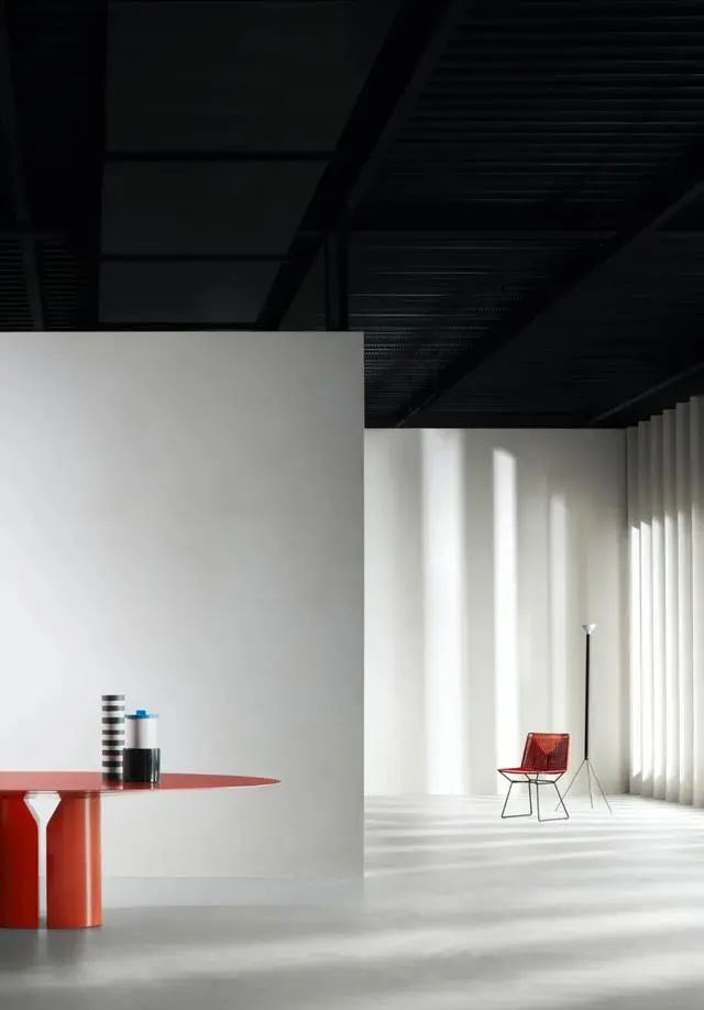 展廳家居物件形色各異,陽光從混凝土百葉窗中照射進來,為MDF Italia品牌增添了光彩。