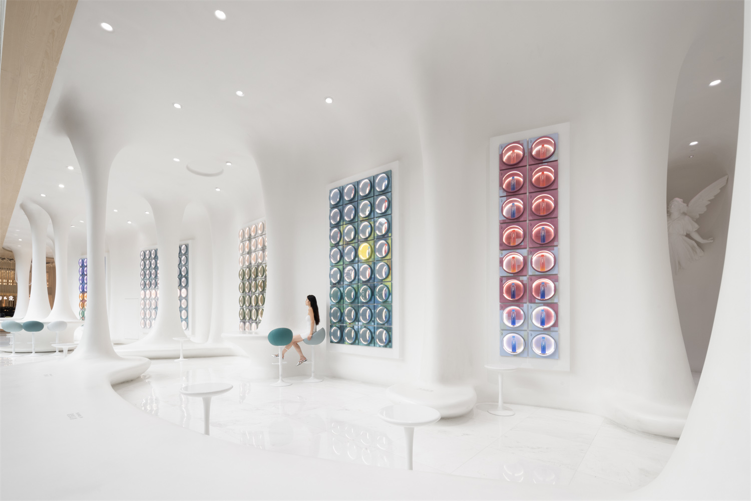 白墻上,一個個色彩漸變的取貨柜猶如拼圖塊,拼插為一幅幅方形畫作,難以取物的高處格口巧妙地作為隱蔽回風口,或是單純陳列的窗口。色彩被分割,再以分離的筆觸織綴成畫。后退幾碼,漸變的色塊突然各得其所,凝結為閃爍生命力的花,畫作的印象方透過朦朧的肌理同光一起折射而來。團團的色彩如花朵在心底暈染,寂靜里綻開一個無限光輝的春天。