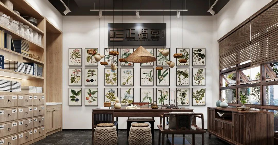 主治醫(yī)師(老中醫(yī))診室,空間清雅明亮,身后的墻面展示著幾百年前李時珍在本草綱目中手繪的草藥圖案。
