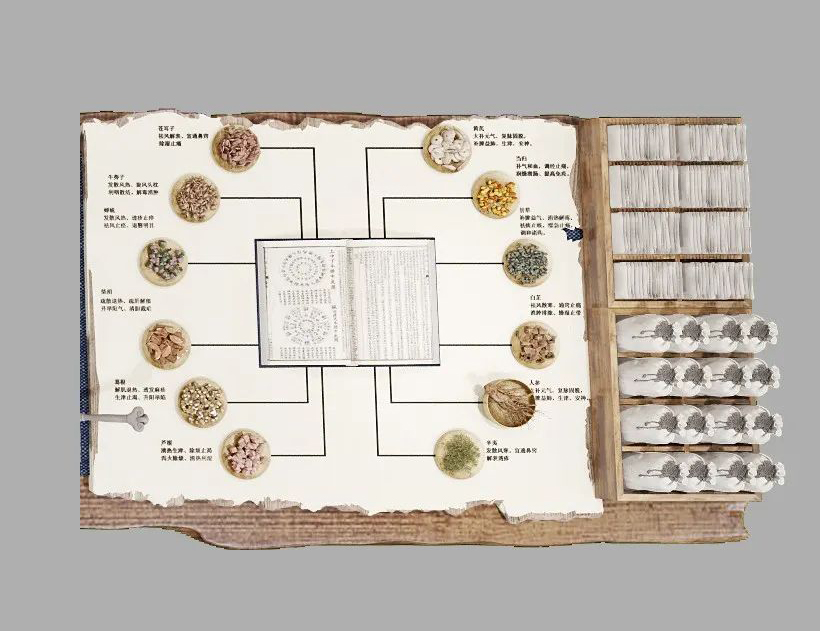 中醫(yī)文化展臺--通過對藥材凈制、切制、炮制等主要工序,來展現(xiàn)幾千年來的漢方制作流程,一本古老醫(yī)學(xué)書籍,展示著應(yīng)季的調(diào)養(yǎng)漢方,旁邊已制作好的中藥飲片,讓人生動地了解中醫(yī)文化,達(dá)到寓教于樂的目的。