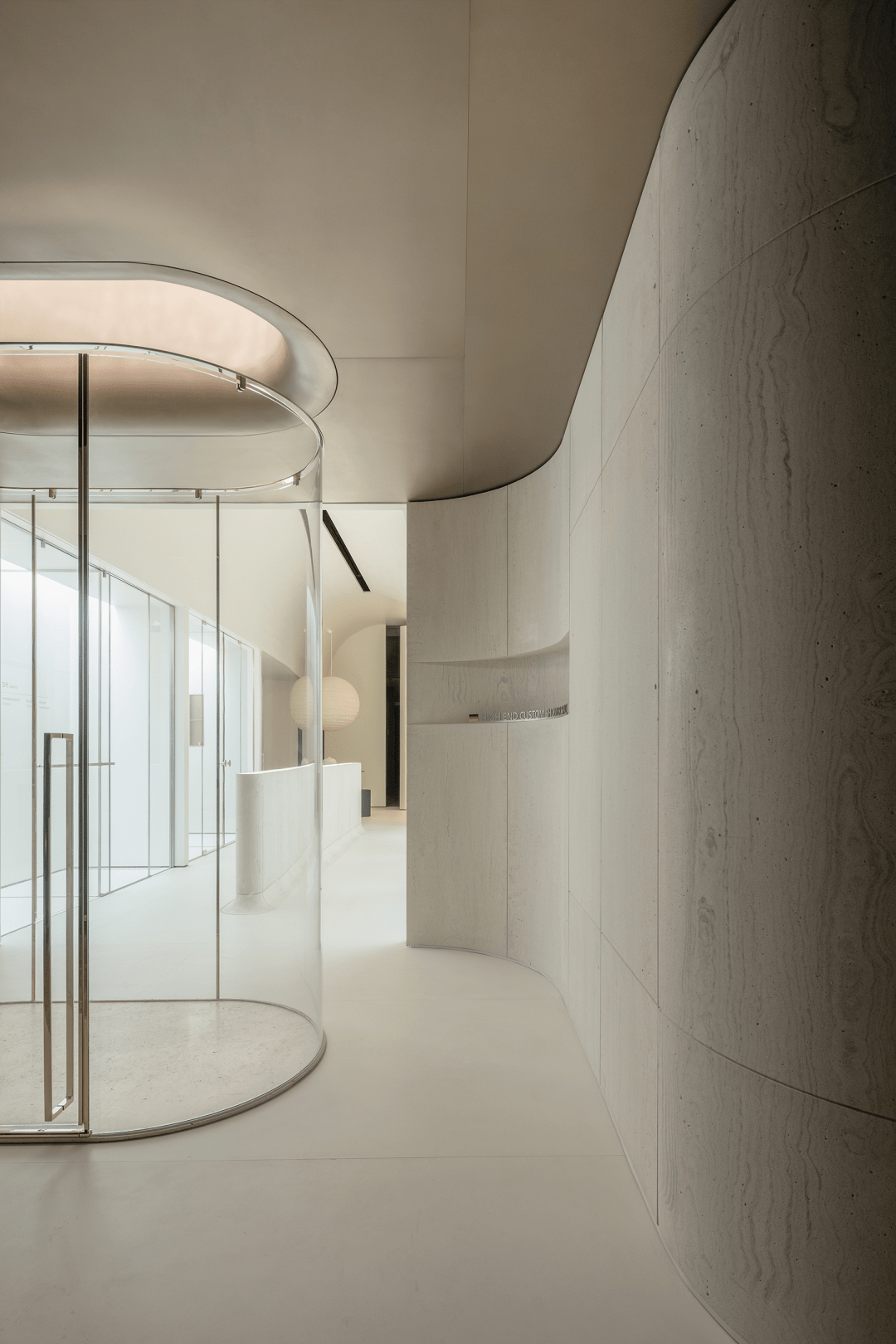 設(shè)計氛圍在整體空間的考量上偏向于安靜、自然,沉浸式的包裹感,能讓人有停留的意愿。并利用層高,做了高而深的拱形天花,對應(yīng)過去是一個窄小的門洞,以曲面分割而不分離空間的設(shè)計形式來呼應(yīng)表達(dá)。它不僅是一個展廳,還是關(guān)于品牌與產(chǎn)品藝術(shù)的結(jié)合造物,彰顯空間格調(diào)。