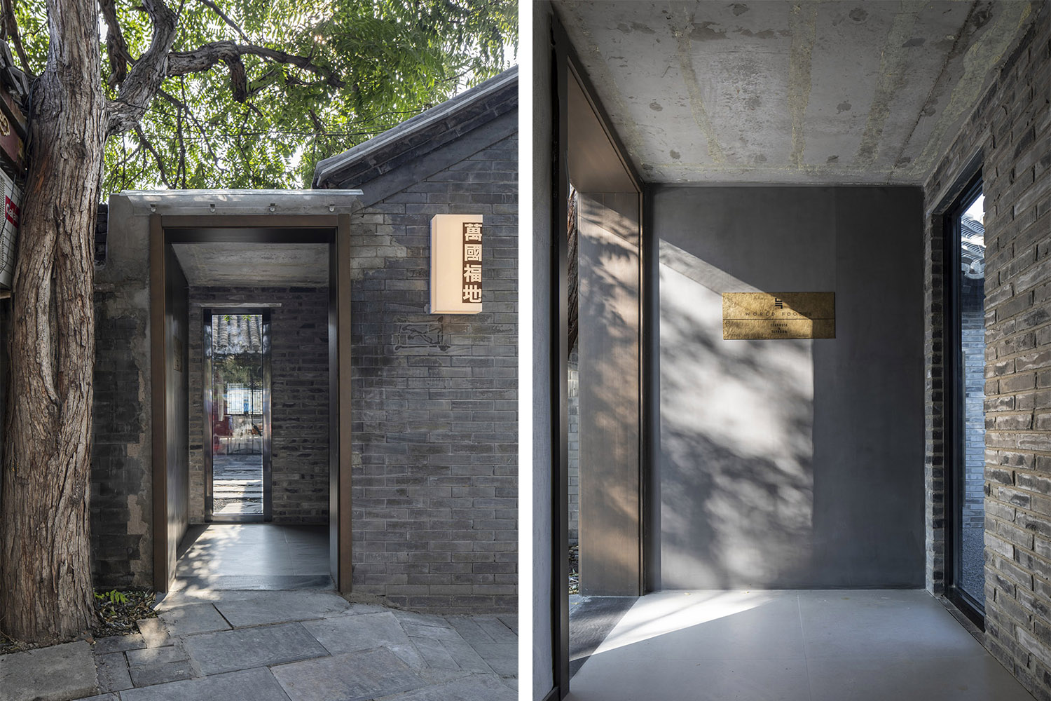原生場地是一個面朝南新華街的合院。從狹窄的入口通行,空間關系是北京傳統四合院的簡化版,我們對院子做了重新解構——盡管原有的空間屬性是全封閉的,設計師希望仍然保持疏密有序的感覺,因此將封閉的院子做得盡量通透、明亮。我們注重進入內庭院后的感受,來訪者所見皆是自己視野內的建筑,這是貫穿在設計過程中的邏輯,既需要有一定的透氣感,也要保證私密性。