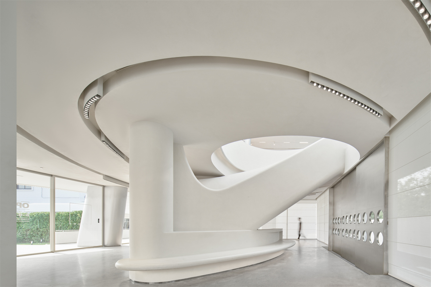 柔軟曲線的檐口大弧度,蔓延至行云流水般的樓梯造型,宛如貝殼,塑造親海洋生物屬性的未來藝術感,形成空間氣場的獨特性和差異性,契合拍攝服務與社媒傳播的瞬時場景記憶。