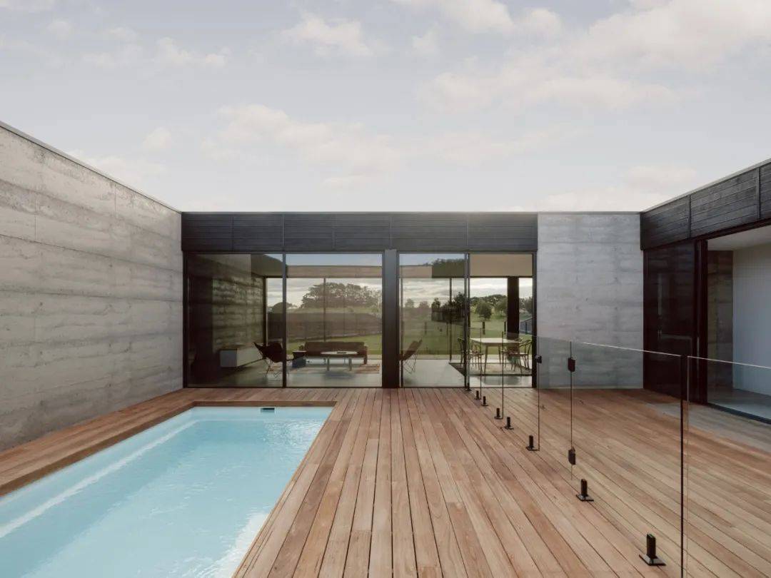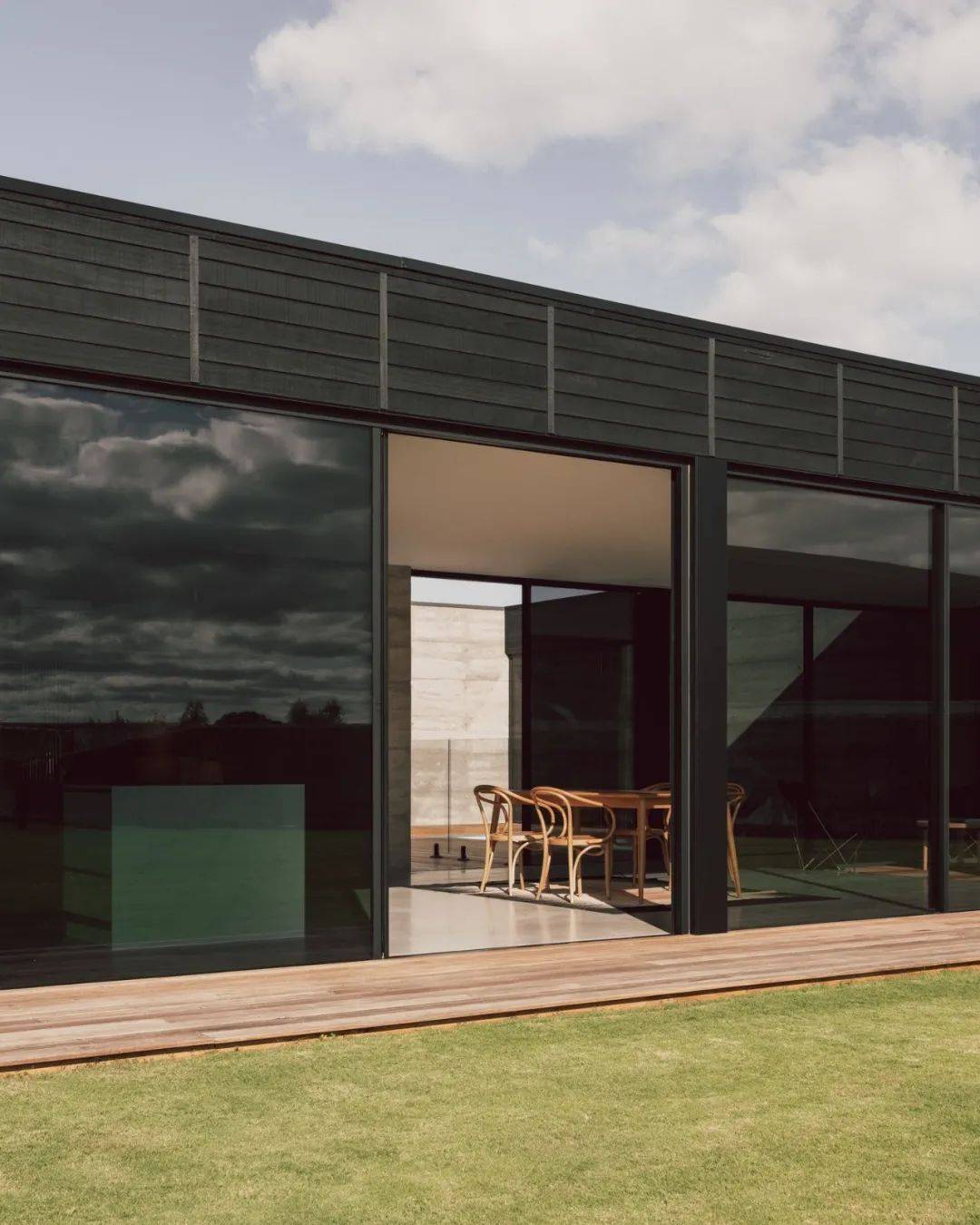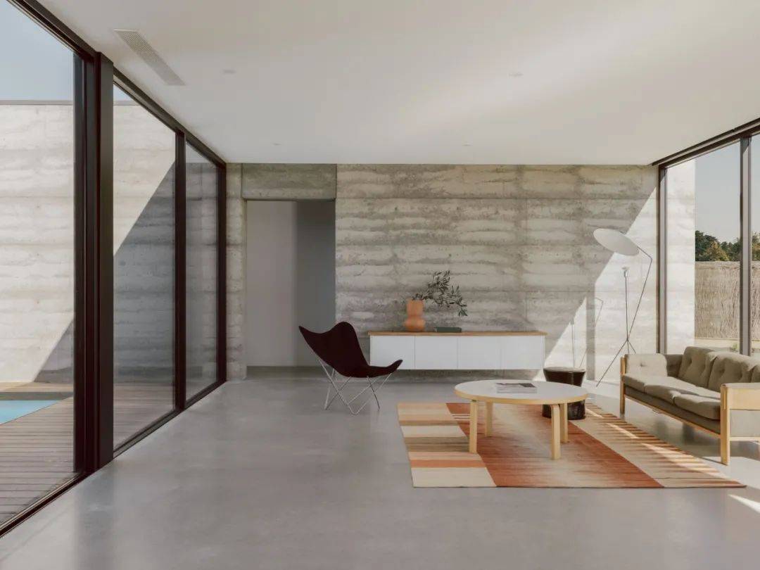 與深色、整體的外觀形成鮮明對(duì)比的是,內(nèi)部采用了600毫米厚的夯土墻和木材裝飾板,營造溫暖色調(diào)。中央庭院和游泳池遠(yuǎn)離自然環(huán)境,住宅的核心是鼓勵(lì)玩耍和娛樂。