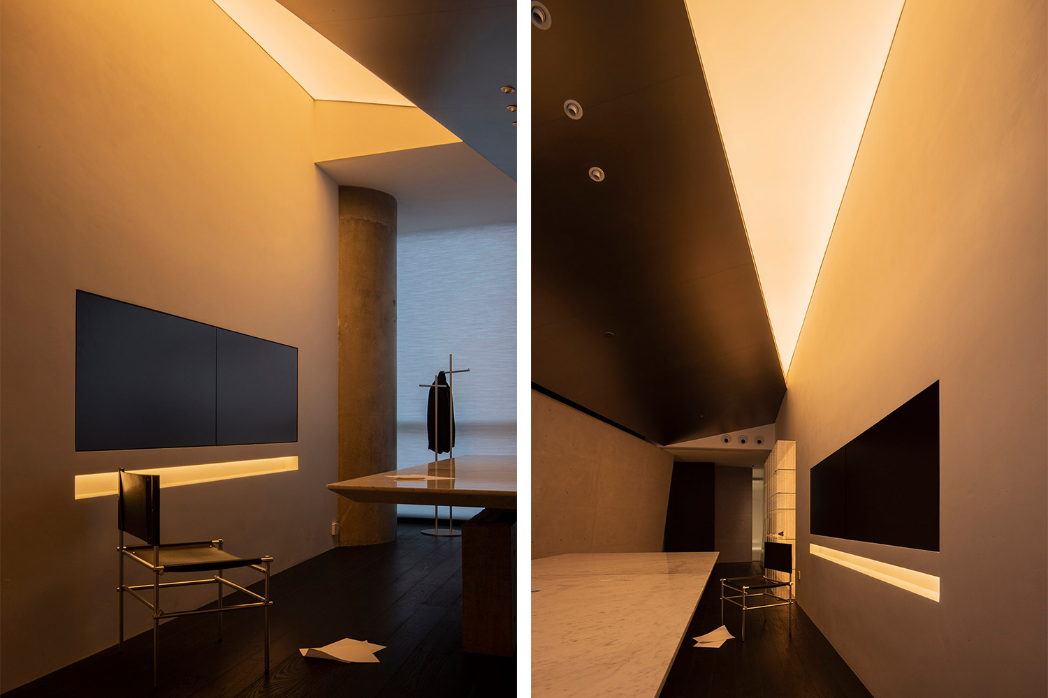 天花的形式遵循整個(gè)空間的構(gòu)建邏輯,自然地在辦公區(qū)和會(huì)客區(qū)形成光膜,成為空間中主要的照明。即使是人造光源,我們也希望它是長(zhǎng)在這個(gè)空間結(jié)構(gòu)里的,是空間構(gòu)建邏輯之下順勢(shì)而為的產(chǎn)物。