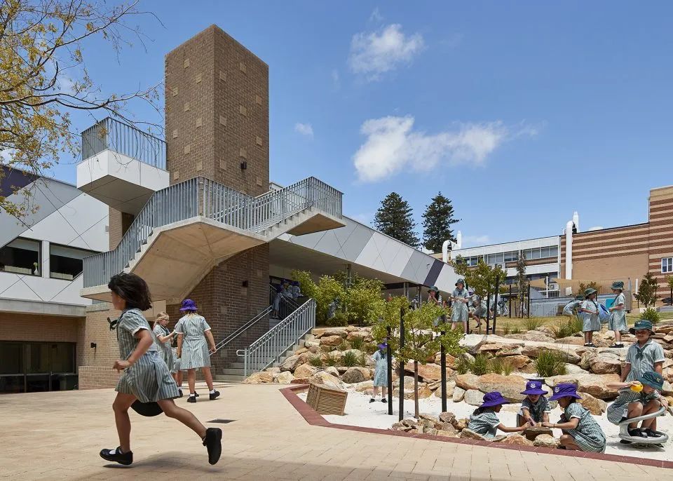 項目位于一個陡峭的斜坡上,內容包括對一棟遺產建筑以及一棟建于1980年代的教學樓進行翻修,同時額外修建一棟新的建筑。這三棟建筑各自擁有不同的樓層。受到保護的校園核心地帶坐落著寬闊的天然操場,這里也是該項目的亮點所在。操場與教室形成了積極的連接,可作為教學空間的延伸,同時為各個功能空間提供了適宜的路徑。